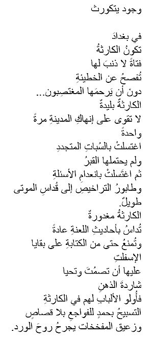 Husam Al-Saray was born in 1982, near the beginning of Saddam’s reign, and grew up during the Iran-Iraq War. After graduating from the University of Baghdad with an engineering degree, Al-Saray changed career tracks to focus on writing poetry. He quickly gained a voice in Baghdad by reading at cafés and publishing in Iraqi newspapers. Two years in a row he has been invited to perform at the Murbid Poetry Festival in Basra, a gathering of the who’s who of Iraqi poets. At the festival, he shared poetry from his collaboration project with his fellow poets, “The New Young Poets,” who received a modest grant from the Iraqi Ministry of Culture to sustain their living from 2012 to 2013 as they composed poems. Also during that time, Al-Saray and the other New Young Poets compiled poetry from the anniversary of the US invasion of Iraq to present time in a collection titled A Biography of Iraqi Culture. In addition, Al-Saray manages Bayt AlShi’r (Line/Home of Poetry), a poetry project set out to give voice to any and all humanitarian issues of the Arab world. Since 2004, he has worked as a freelance journalist, writing for the online paper Modern Discussion, a media outlet that publicizes important dialogues about secularism and human rights. His 70-page book of poetry, The Desert Laughs Alone (2009), published by Beirut press, Dar Al-Farabi, depicts a destroyed Baghdad during the US occupation of Iraq.